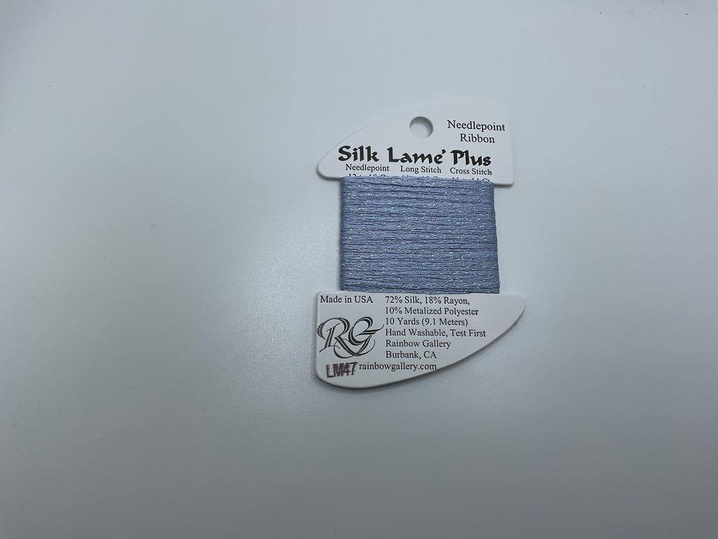 Silk Lame Plus is silk and metallic braided together to create a flat ribbon thread. Perfect on 18 mesh canvas as is off the card. Can also be used on larger mesh canvas for a lighter smooth texture. All colors match Silk Lame Braid with the same color number and name. It consists of 72% Silk, 18% Rayon, 10% Metalized Polyester. It comes in 10 yard or 9.1m cards. It is hand washable, though test first
